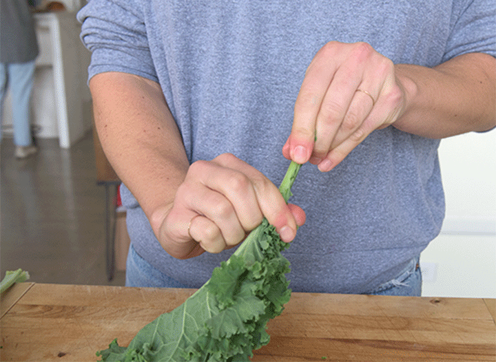 Be sure to thoroughly wash and de-stem your kale leaves. You can either use a knife to cut around the stem, or slide the leafy part off like so:
